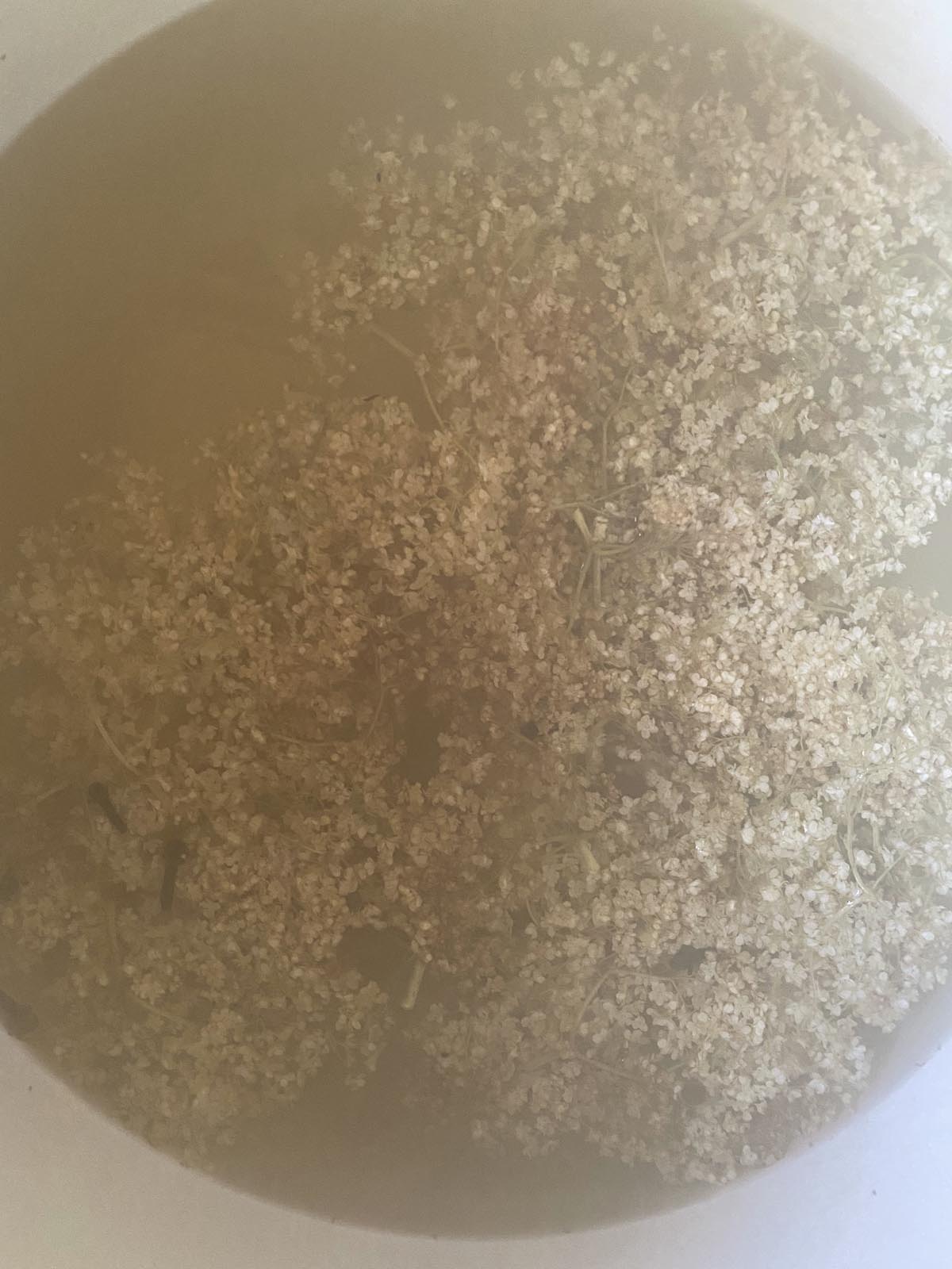 Zitronen waschen und auspressen, Blütenstängel abschneiden, Dolden abschütteln und säubern (nicht waschen wegen Aromaverlust!) in einen irdenen (oder Edelstahl-)Topf geben und mit 10 Liter Wasser samt Essig, Zitronensaft, aufgelösten Zucker übergießen. Mit einem Tuch abdecken und an einen warmen, sonnigen Ort stellen. Nicht vergessen, den Ansatz ab und zu umzurühren.