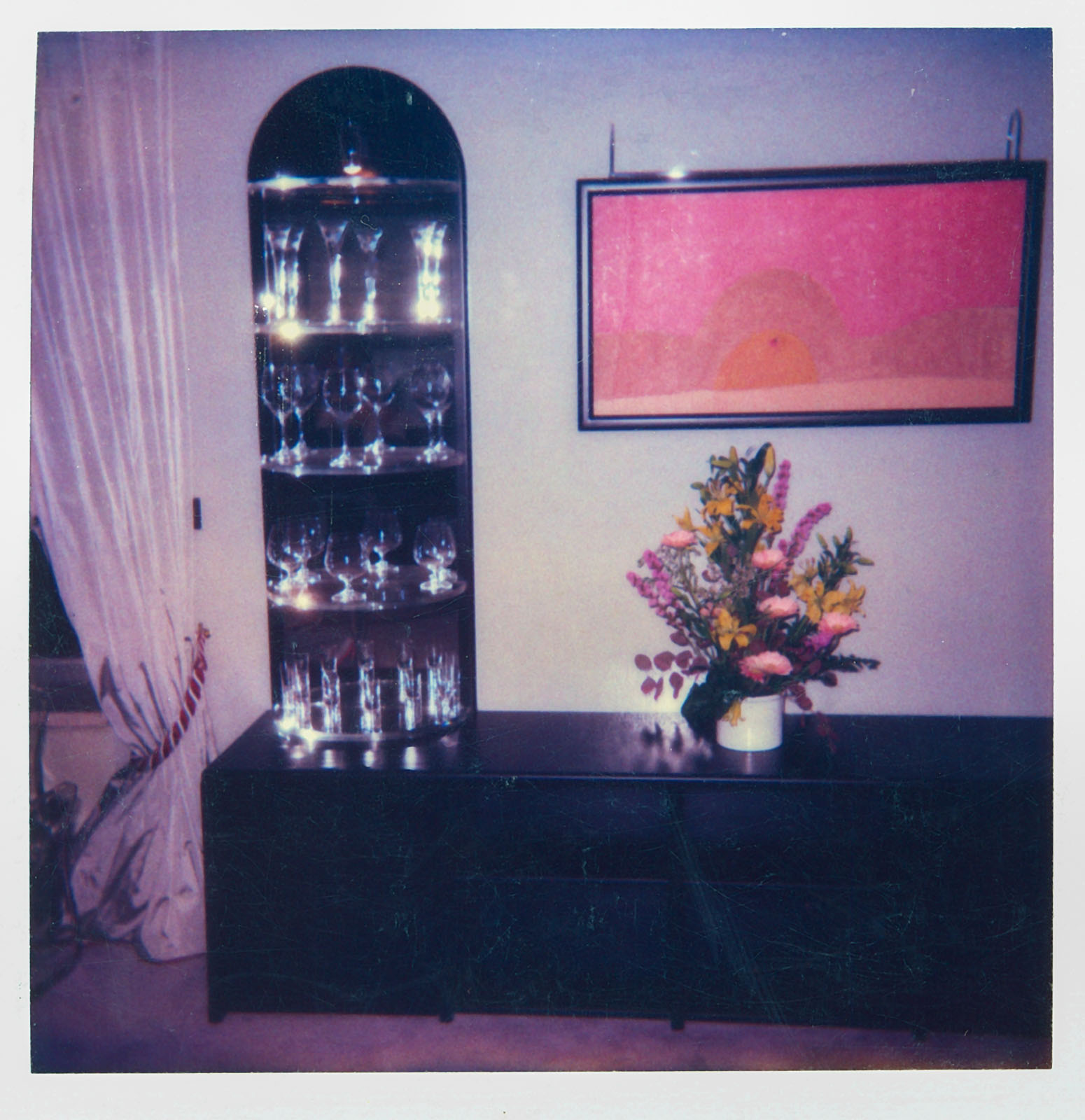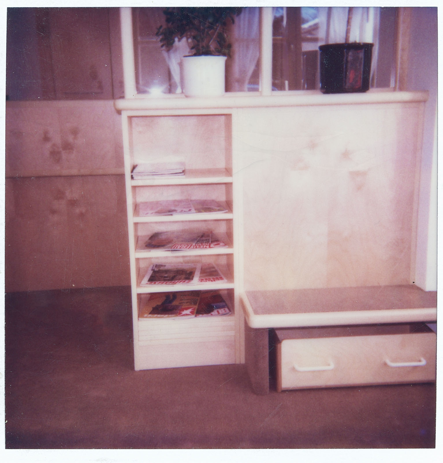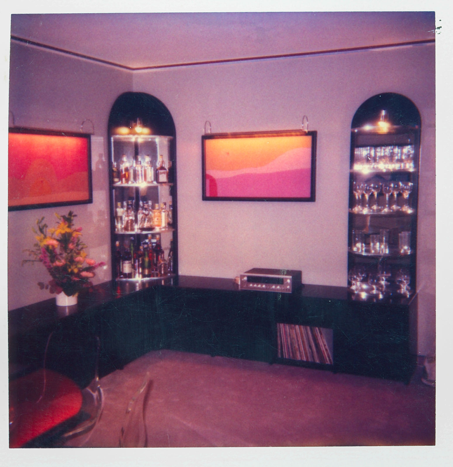 schwarzer Schleiflack - Plexiglas - Spiegel und "angelehnte" Boxen, Couchtisch mit dem darin eingebauten RGB-SONY-Projektor VPH 722QM und Videoleinwand