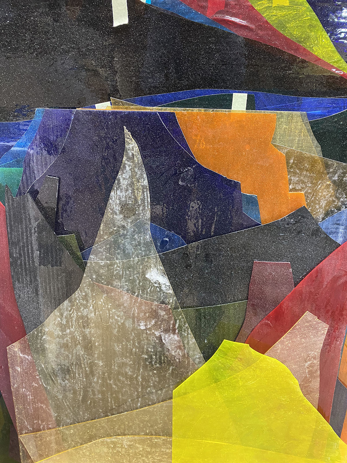... gefertigt als Geschenk zu einer Küche für einen Vitrinen-aufsatzschrank. Zum Glück sagte der Bauherr: "was soll ich mit dem Scheiß?" - er bekam dann Klarglas, seither hängen die drei friedlich an meiner Treppe.