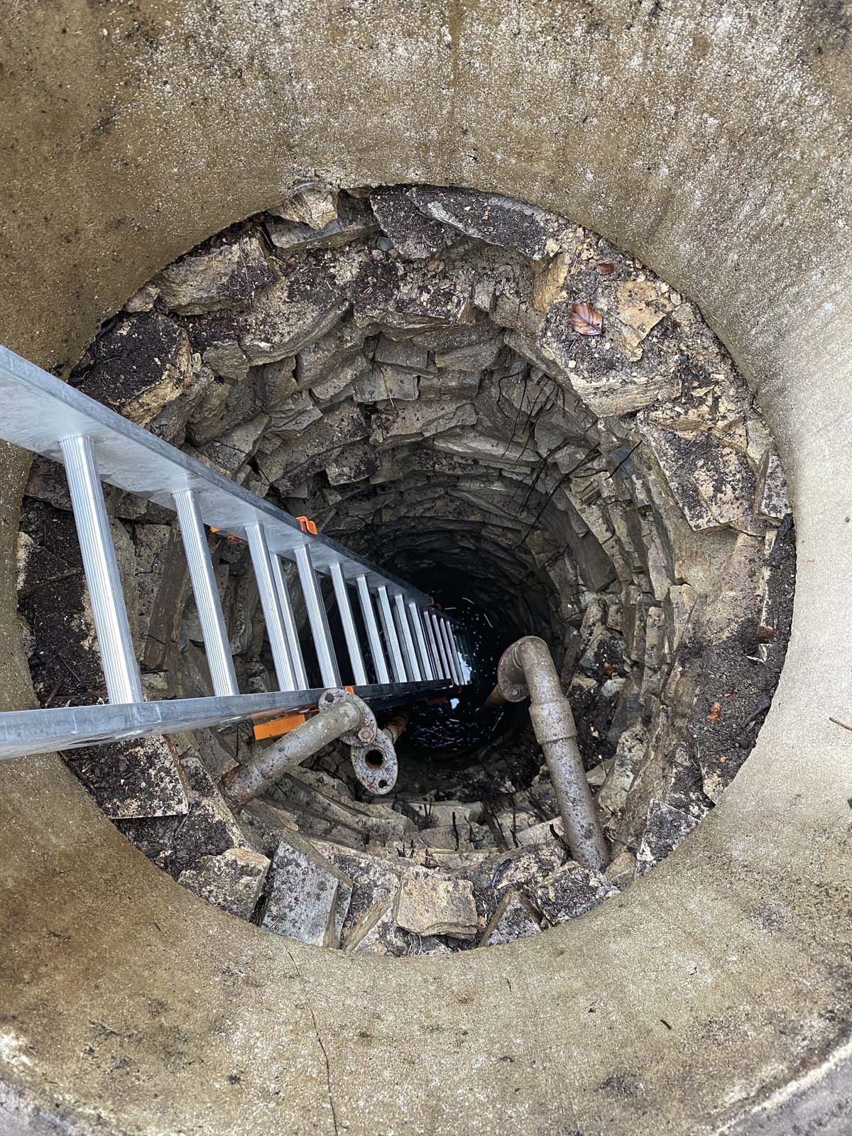 Entrümpelung des Brunnens, das Wasser soll später für die Bewässerung des Gemüses genutzt werden. Die alten verrosteten Verrohrungen wurden abgeflext