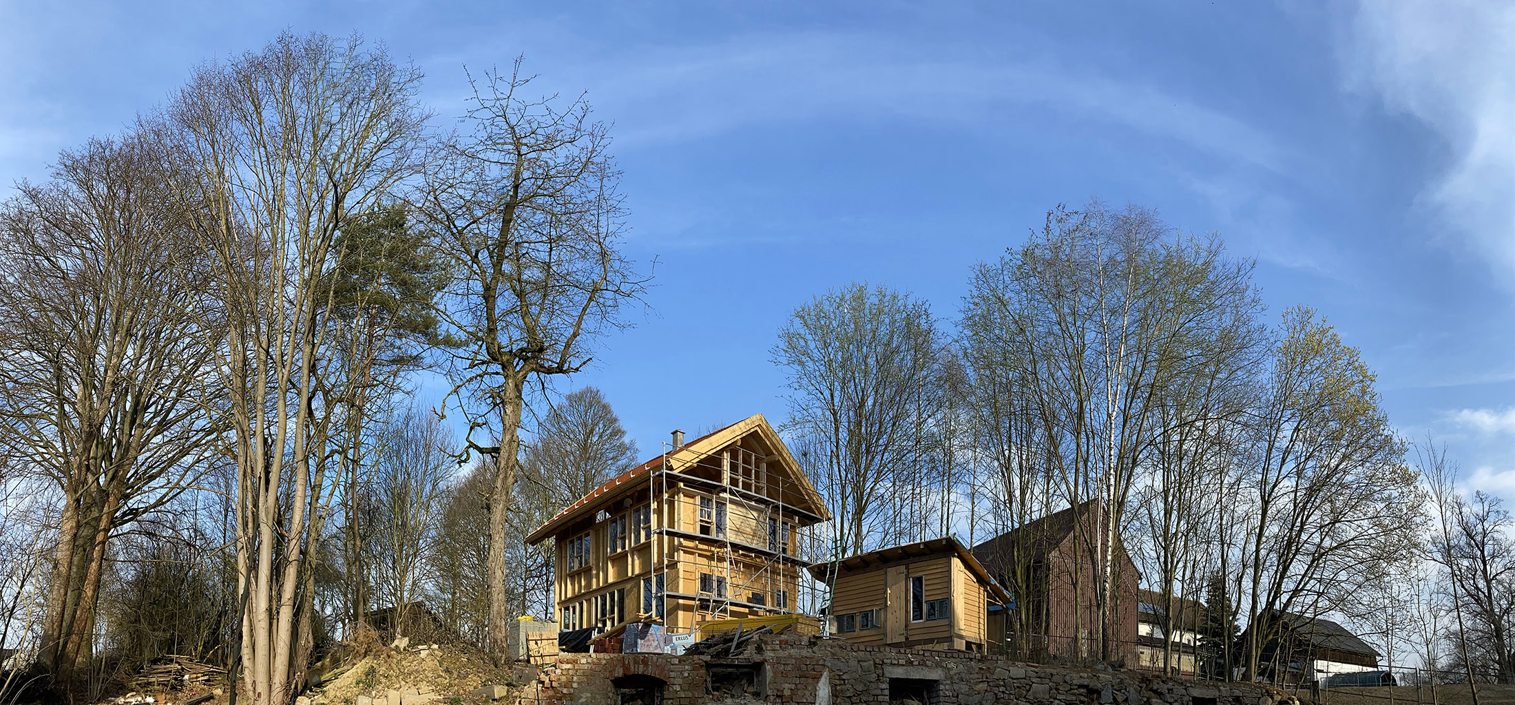 16:45 Uhr - der First für die EG-Anbauten im Osten mit Unterblatt, damit der Südfirst des Gewächshauses sauber befestigt und beide sauber miteinander kraftschlüssig verbunden werden können.