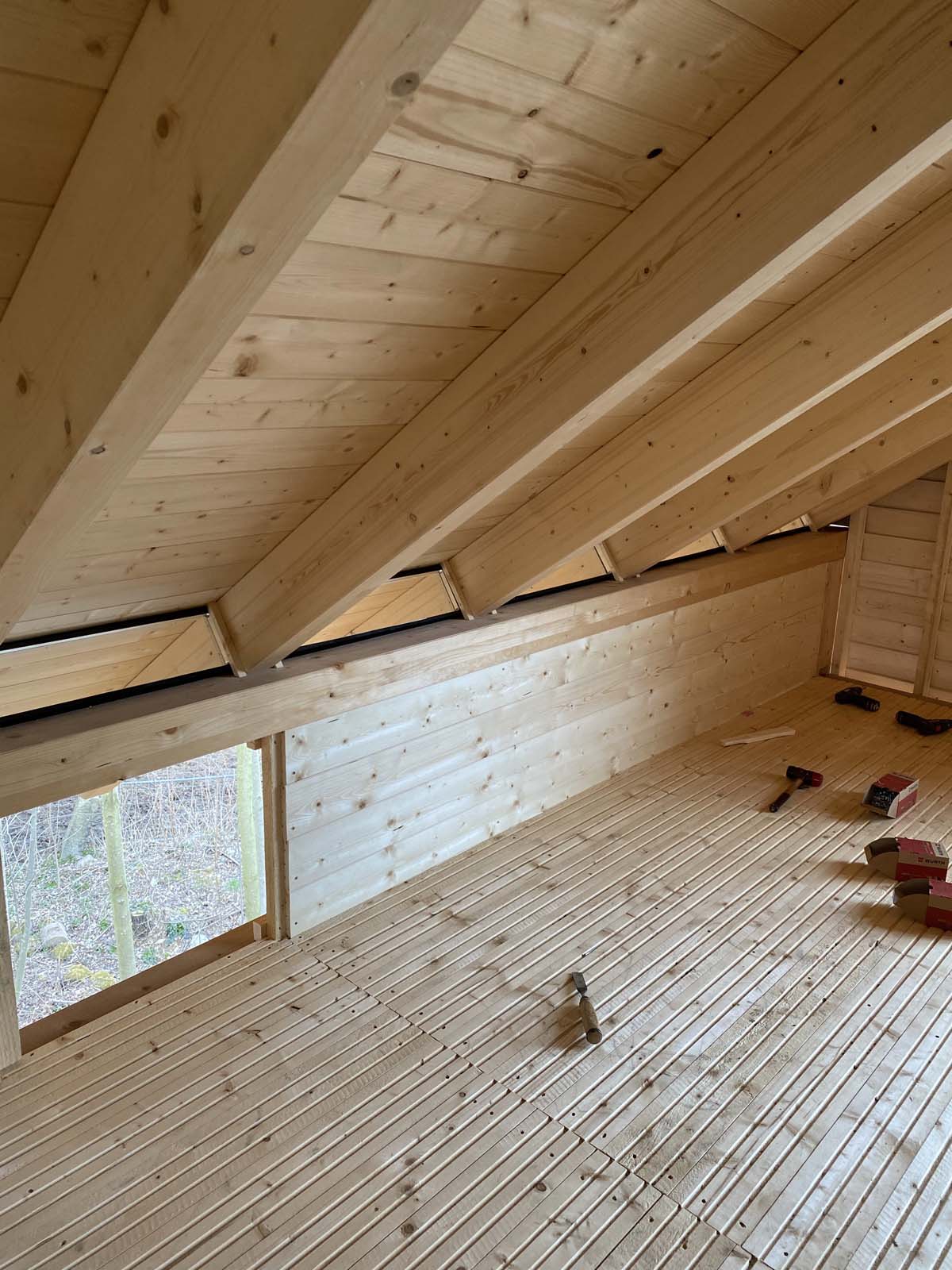 das Bad wird benutzbar gemacht und die Fensterchen zwischen die Sparren eingebaut